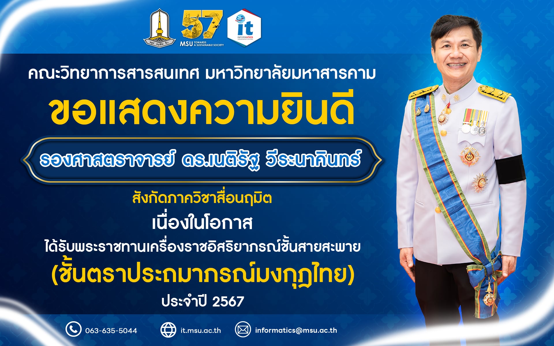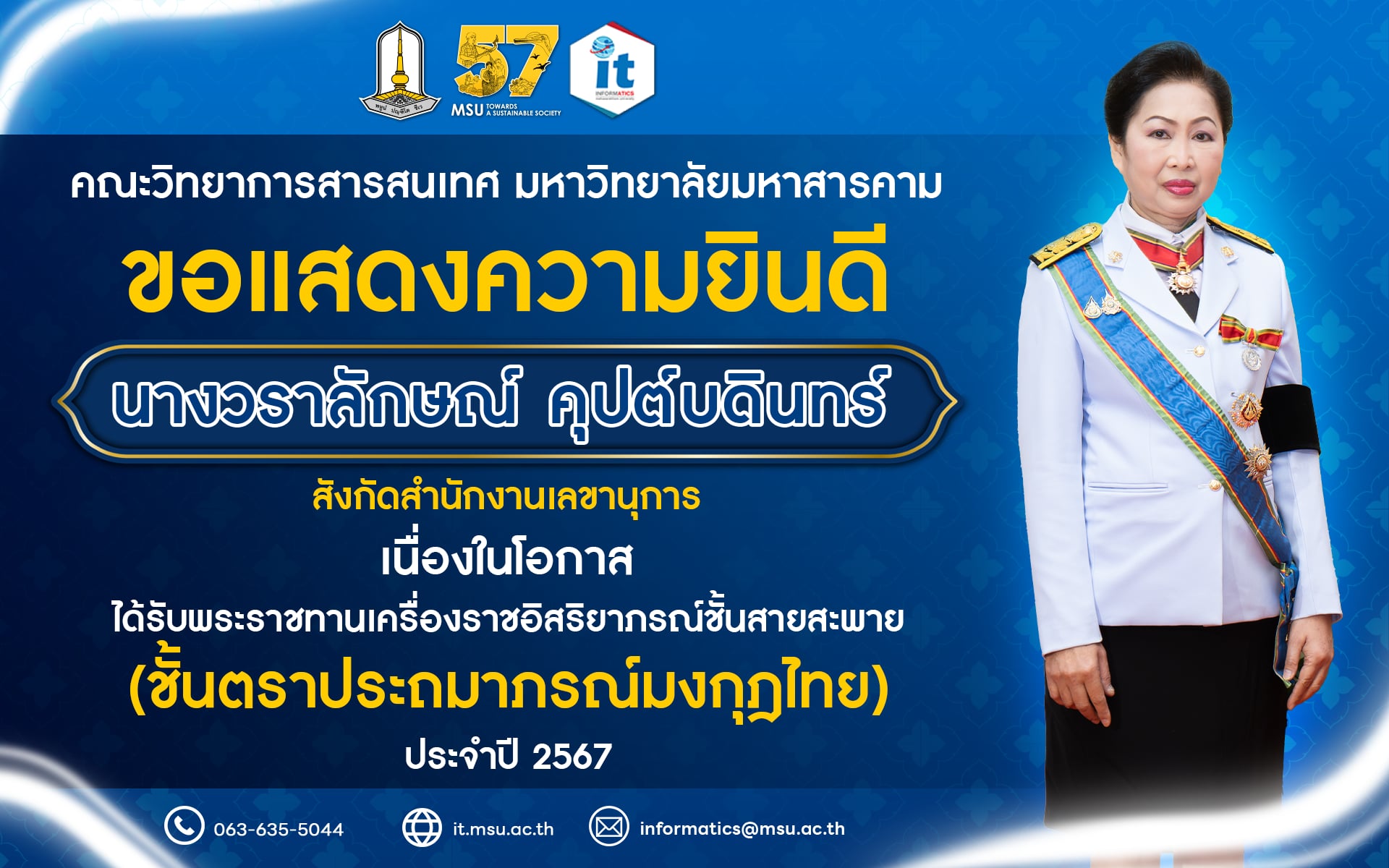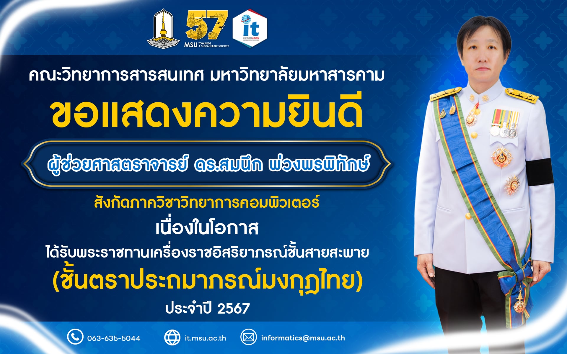 คณะวิทยาการสารสนเทศ มหาวิทยาลัยมหาสารคาม ขอแสดงความยินดีกับบุคลากรของคณะฯ เนื่องในโอกาสได้รับพระราชทานเครื่องราชอิสริยาภรณ์ชั้นสายสะพาย (ชั้นตราประถมาภรณ์มงกุฎไทย) ประจำปี 2567 ได้แก่