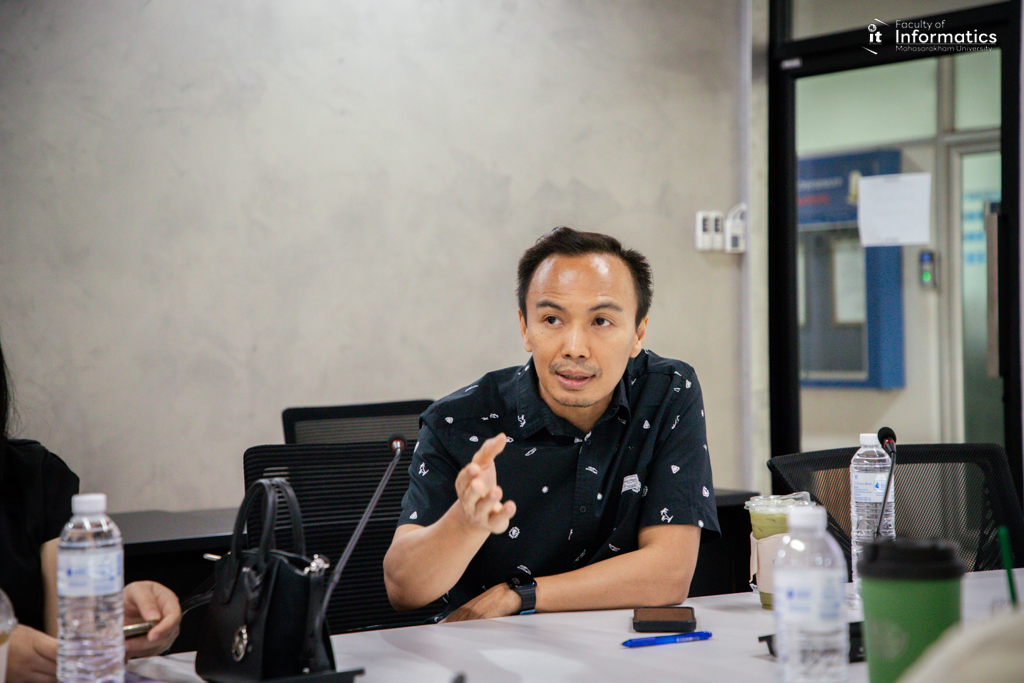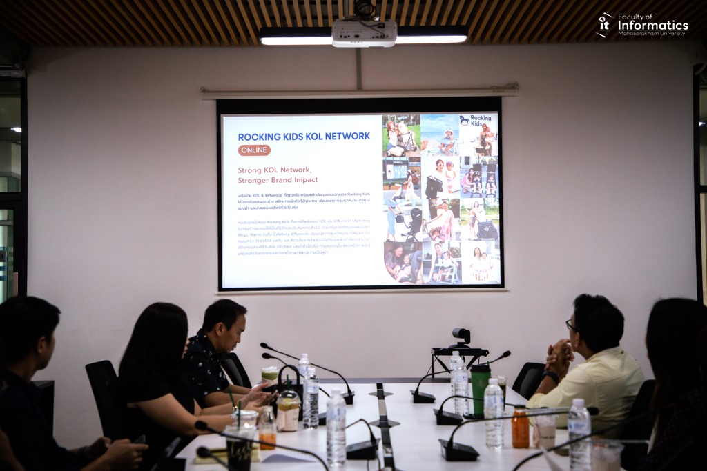 ผู้ช่วยศาสตราจารย์ชุมศักดิ์ สีบุญเรือง รองคณบดีฝ่ายบริการวิชาการและบริหารจัดการเพื่อความเป็นเลิศ พร้อมด้วยหัวหน้าภาควิชาสื่อนฤมิต และคณาจารย์จากภาควิชานิเทศศาสตร์ คณะวิทยาการสารสนเทศ มหาวิทยาลัยมหาสารคาม ประชุมหารือร่วมกับคุณเปียทิพย์ ขันถม ผู้จัดการทั่วไป และผู้บริหารจากบริษัท ร็อคกิงคิดส์